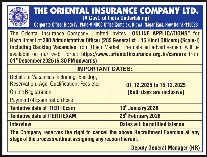 A golden opportunity from Oriental Insurance Company Ltd for the recruitment of 300 Administrative Officers (Scale-I) including backlog vacancies. Apply online for Generalist and Hindi Officer posts and secure your future with a leading government insurance organization.